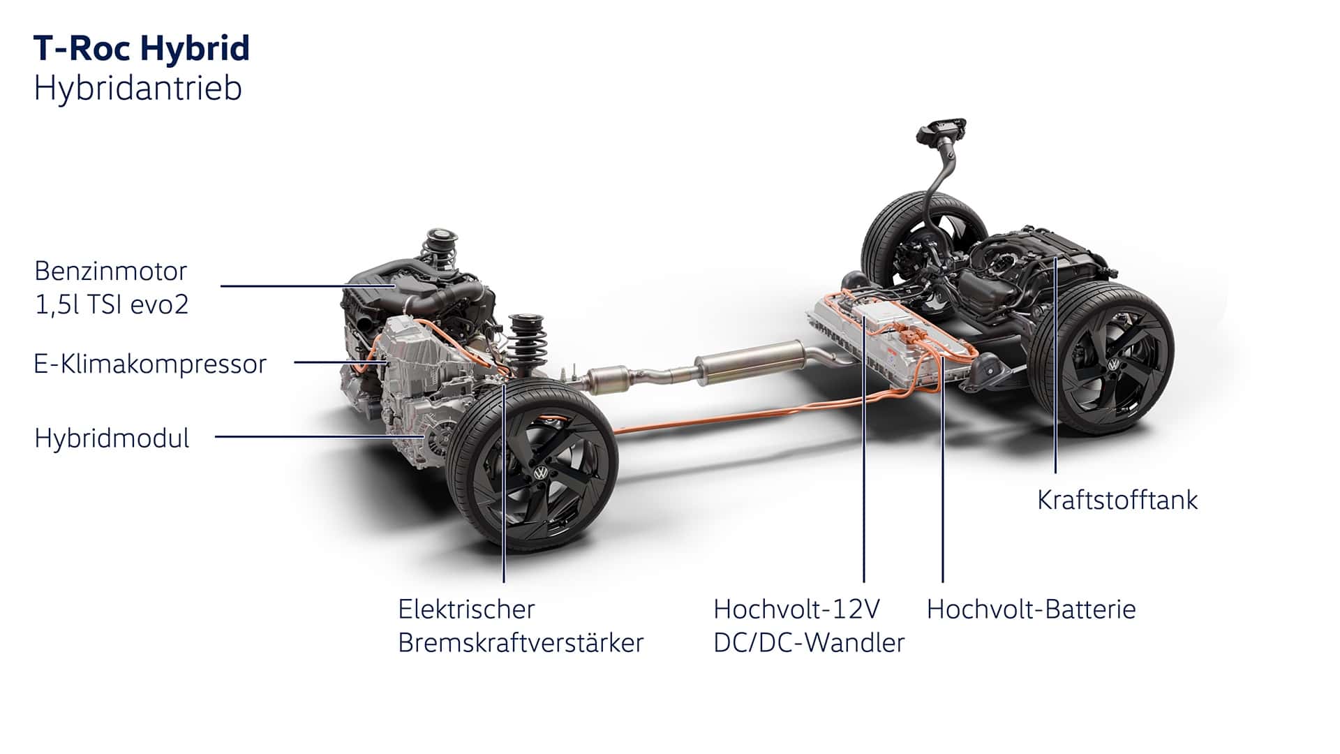 01Híbrido suave de serie. El nuevo T-Roc estará disponible exclusivamente con innovadores motores híbridos de gasolina turboalimentados en el mercado europeo. Para el lanzamiento, hay dos propulsores híbridos suaves de 48 V (1.5 eTSI) con 85 kW (116 CV) y 110 kW (150 CV) Les seguirán dos sistemas de propulsión híbridos completos que se han desarrollado completamente desde cero. Estos siempre tienen tracción delantera. Al igual que con el modelo predecesor, el nuevo T-Roc también estará disponible más adelante con la tracción total 4MOTION, en combinación con el TSI de 2.0 litros, que entonces también se ofrecerá como híbrido suave (mHEV). Un T-Roc R también estará disponible en el futuro como la variante más potente. Todos los híbridos suaves de 1.5 y 2.0 cuentan con una caja de cambios de doble embrague de 7 velocidades.