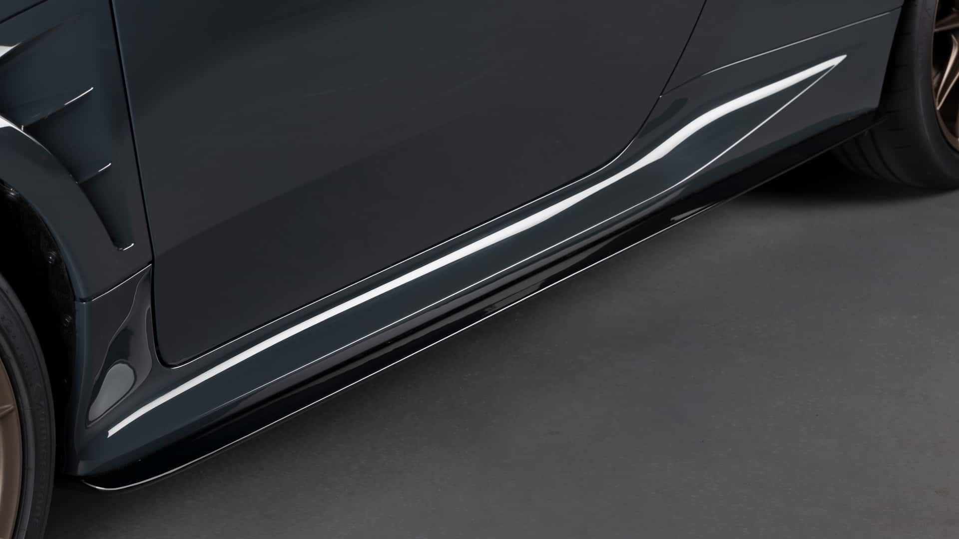 - Equipado con un alerón trasero de fibra de carbono. Otras mejoras exteriores incluyen un alerón delantero, faldones laterales y un capó de fibra de carbono.