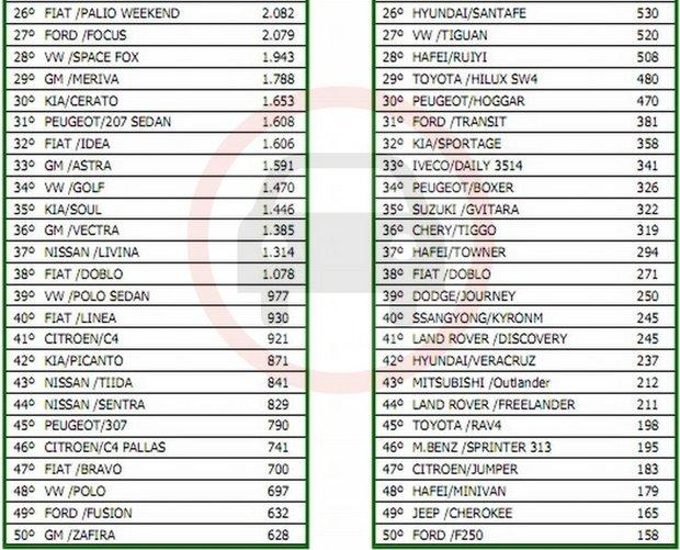 Entre os automóveis, o Uno obteve 21.470 emplacamentos, contra 20.989 do Gol. O Fox terminou na terceira colocação, com 13.156 unidades. Entre os médios, Corolla na liderança (4.016 unidades), seguido por i30 (3.429) e Civic (2.145). Os comerciais leves têm a Strada como líder (10.047), a Saveiro em segundo lugar (5.532) e a Montana em terceiro (3.399)
